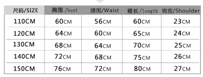 - Size 150 (9-10 years): Length 80 cm, Bust 76 cm